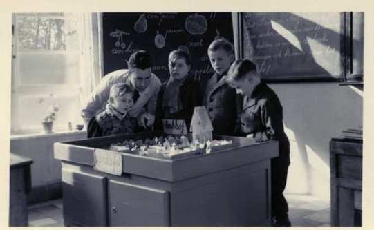 Meester Jozef Vanthuyne heeft in zijn klas in de gemeenteschool aandacht voor de kerkhofperiode. Rond de maquette in de zandbak onder meer Dirk Van Ryckeghem (links)