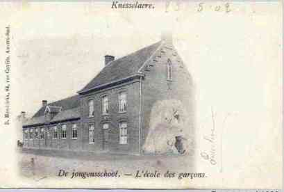Een van de oudste foto’s van de in 1880 gebouwde nieuwe jongensschool. Een restant van de schoolstrijd. (Postkaart 1902, JuGo)