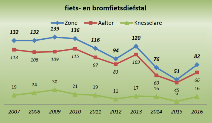 Een toename van fietsdiefstallen zowel in Aalter als in Knesselare is een uitzondering op de licht dalende trend van de andere vormen van (vooral kleine) criminaliteit binnen de gemeenten.