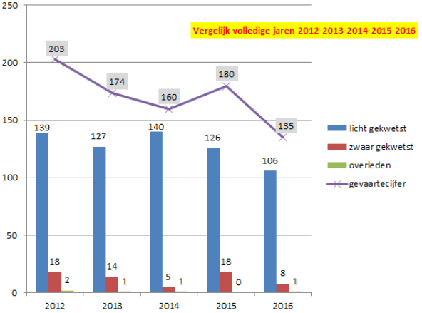 Het cijferoverzicht van de jongste vijf jaar (zie grafiek hieronder) leert dat er in de periode 2012-2016 vijf dodelijke slachtoffers vielen op het grondgebied, en voorts 63 zwaargewonden en 638 lichtgewonden.