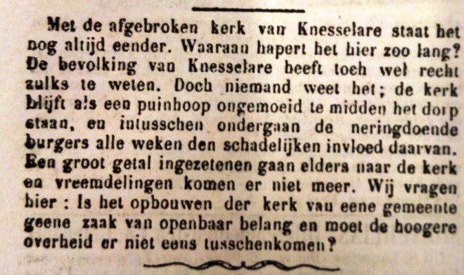 Op 25 december 1887 meldt de Gazette van Eecloo dat Knesselare absoluut ontevreden is omdat men al zo lang moet wachten op een nieuw gebouw. De ‘neringdoeners’ vooral zijn ontevreden omdat “de vreemdelingen” niet meer komen en de ingezetenen “elders ter kerke” gaan.