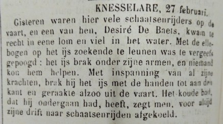 “’t Zijn geen winters meer als vroeger”? Het is al eens goed om in (heel) oude kranten de kleine berichtjes te lezen. In februari 1885 was het bar koud. Zo koud dat er werd geschaatst op de vaart. Er waren toen 22 ijsdagen. Dat hebben onze generaties nauwelijks meegemaakt (in 1982 en 1983, en vooral in 1963-64 met maar liefst 37 ijsdagen. Ook meer dan honderd jaar geleden was schaatsen op de vaart “uitzonderlijk”, en dus krantennieuws. Zeker als er eentje door het ijs viel.