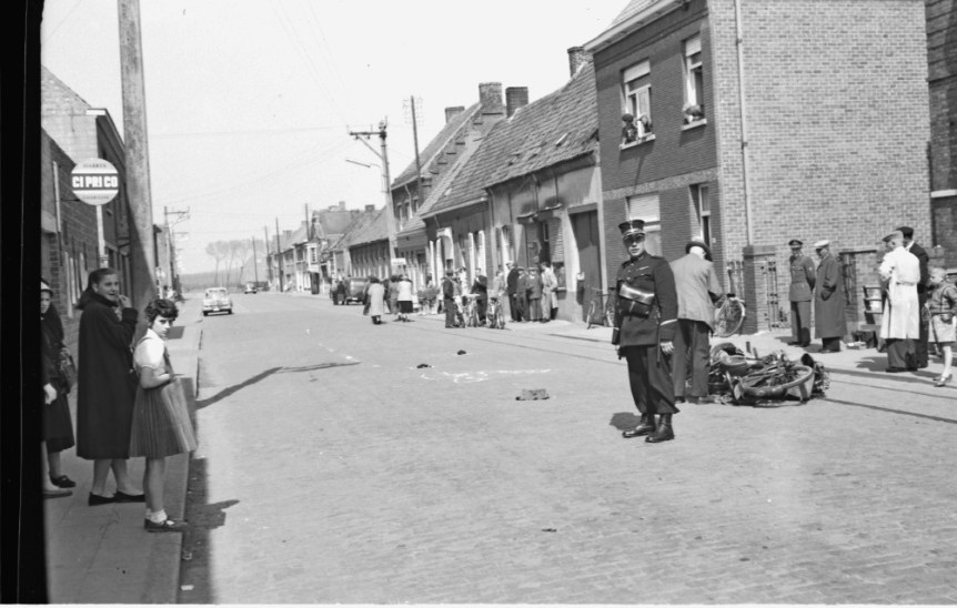 In de jaren 1950 was de verkeersveiligheid niet wat ze vandaag is. Gemotoriseerd verkeer was een jong gevaar. Ook in 1957. Robert De Vriendt uit Oedelem overleed na een aanrijding in de Kloosterstraat met motorrijder Carolus Carette uit Knesselare. Laatsgenoemde liep breuken en zware verwondingen op zie foto). In het Drieselken botsten twee fietsers in volle vaart. Lucien Nemegeer (14) en André De Meyer (23) werden “bewusteloos en bloedend” naar het ziekenhuis gevoerd.