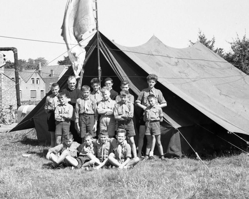 De KSA’ers “jongknapen” zwoeren trouw aan hun idealen in het bijzijn van E.H. Gyselbrecht, gouwproost Oost-Vlaanderen en de alomtegenwoordige “Coninscke”…(zie foto)
