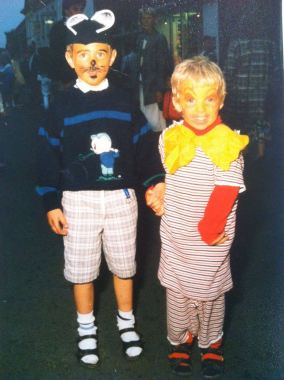 De dag voordien had ik – samen met mijn neef Jan – het gras afgereden. Op die bewuste avondmarkt liepen mijn neef en ik mee in de stoet. Jan als poes en ik als clown. Ik herinner me dat we zenuwachtig waren om te vliegen. Na de stoet rende we heel snel naar het oud voetbalveld en namen plaats in de helikopter. Een poes en een clown. Samen in een helikopter. Hoog, boven Knesselare. Ik weet nog dat onze ogen de hele vlucht zochten naar een stuk achtertuin waarin we de dag voordien ‘JAN EN TIM’ in het gras hadden gemaaid. Maar ik kan me niet meer herinneren of we ‘ons kunstwerk’ daadwerkelijk hebben gezien.