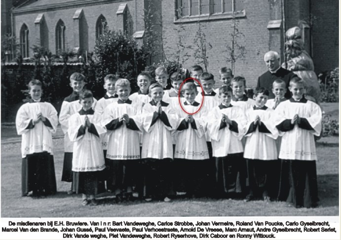 Vandaag voor velen misschien moeilijk te vatten, maar de misdienaarstijd maakte op veel jonge kinderen toch indruk. Zo ook voor Arnold: “Als kleine jongen uit het vierde studiejaar werden we door pastoor Bruwiere opgeleid. Het ‘Confiteor’ diende van buiten geleerd te worden. De eerste Latijnse woorden waar we geen snars van begrepen. Het was de periode vóór het Vaticaans Concilie en de priester stond nog met zijn rug naar de gelovigen. Er werd ons op het hart gedrukt dat een misdienaar “nooit achterom” mocht kijken, “zelfs niet als het kerkportaal zou instuiken!’… Hij zag natuurlijk niet dat we tijdens het Lof met het wierookvat grote cirkels draaiden.