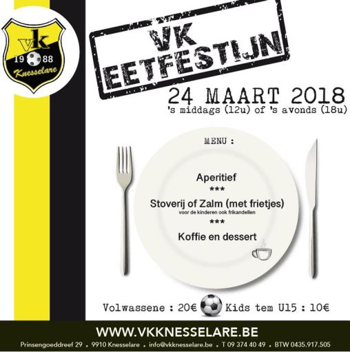 Het jaarlijkse eetfestijn van VK heeft plaats op zaterdag 24 maart. Volwassenen kunnen kiezen tussen stoverij met frietjes of zalmpapillot (20 euro). Inbegrepen zijn een aperitief en een dessertbordje. Kinderen kunnen kiezen voor stoofvlees of frikandel met frietjes (10 euro). Voor hen voorzien we een ijsje als dessert. Inschrijven kan HIER
