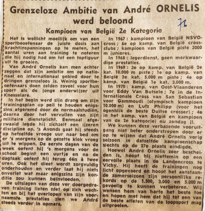 In maart geeft de krant een overzicht van het eerste deel van de carrière van de beste Knesselaarse atleet in die tijd, die in 1970 Kampioen van België werd.
