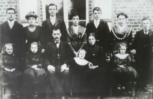 Mijn vader Kamiel Focke (bovenaan, derde van rechts) kwam uit een groot boerengezin (13 kinderen, waarvan 11 op de foto) aan de Driepikkel. Zijn moeder was Paulina Vermeire (onderaan met de kleinste aan de arm). Een bijzondere vrouw toch. Ze hielp de zieken, werd “geroepen” bij de geboorten als kraamverzorgster (achterwaarsterigge) en ze werd gevraagd om de doden ‘af te leggen’. Zat er iemand in de miserie, dan gingen ze om ‘moeder Pauline’.