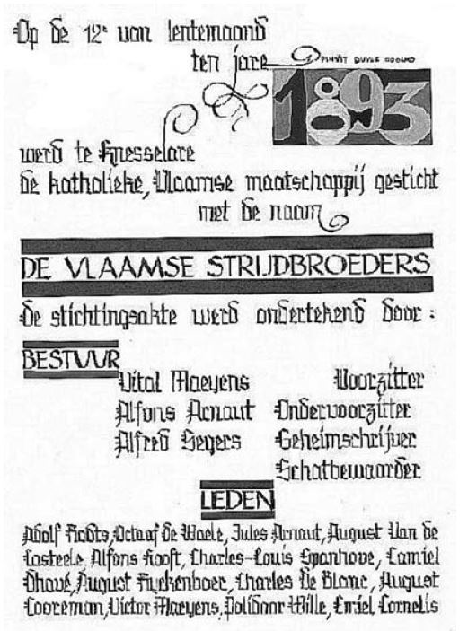 Voor zover we weten is er in Vlaanderen maar één vereniging die zich “Vlaamse Strijdbroeders” noemt. Einde vorige eeuw (1893) kozen enkele jonge mannen in Knesselare die naam voor hun bond. Ze deden dat omdat ze Vlaamsgezind waren, in een tijd dat Frans ook in Vlaanderen nog de voertaal was in politiek, onderwijs, gerecht en leger. Ze deden dat ook uit liefde voor toneel en omdat ze best wel zin hadden om mekaar geregeld te treffen voor vergaderingen die werden gekruid met zang, voordracht, debat en “een goed glas bier tegen ne kluit de grote pint”.