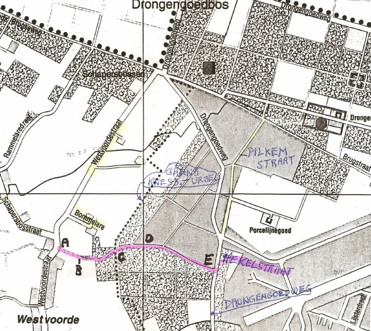 Eric Blondia, al jaren als natuurliefhebber heel bekommerd om het Drongengoedgebied, woont onmiddellijk in de buurt. Hij geeft hierover aan Knesselaars Nieuws wat duiding. Het Hekelstraatje is een bijzonder oude weg, Een deel van die weg op Knesselaars grondgebied werd later de Schapersbosstraat genoemd, zo leren ons kaarten uit het midden van de 19de eeuw. Een ander deel loopt nog door op Ursels grondgebied. De Hekelstraat werd door de aanleg van het vliegveld in twee stukken gesplitst. Een deel van de weg op Knesselare was en is privaat, maar sinds mensenheugenis ook openbaar. De vervuiling situeert zich vooral in het gedeelte D-E (zie kaart hieronder).