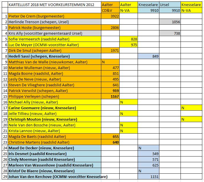 Wat wordt het voor N-VA? In 2012 was er geen N-VA-lijst in Knesselare, en de Aalterse N-VA behaalde – toen ook al in kartel met De Crem – maar 2 van de 19 mandaten van die kartellijst. De strategische keuze om het kartel te behouden is merkwaardig, als je weet dat N-VA bij de nationale verkiezingen van 2014 in Knesselare een stem kreeg van 32 procent van de kiezers (CD&V 23 procent). In Aalter was dat afgerond 34 procent voor de CD&V en 28 procent voor N-VA. Dat de N-VA dit keer meer dan twee zetels zal behalen, zou een evidentie moeten zijn. Maar in het nieuwe Aalter is de kartelformule vooral positief voor de slimme politicus De Crem. Hij heeft zijn belangrijkste opponent geneutraliseerd. Knesselare komt nauwelijks in het verhaal voor. Voor de twee nieuwe Knesselaarse kandidaten (Carine Goemaere, en Christophe Mouton) wordt het vanuit 16de en 17de positie (o.v. van definitieve goedkeuring van de lijst zoals onderaan vermeld) een moeilijke opgave.