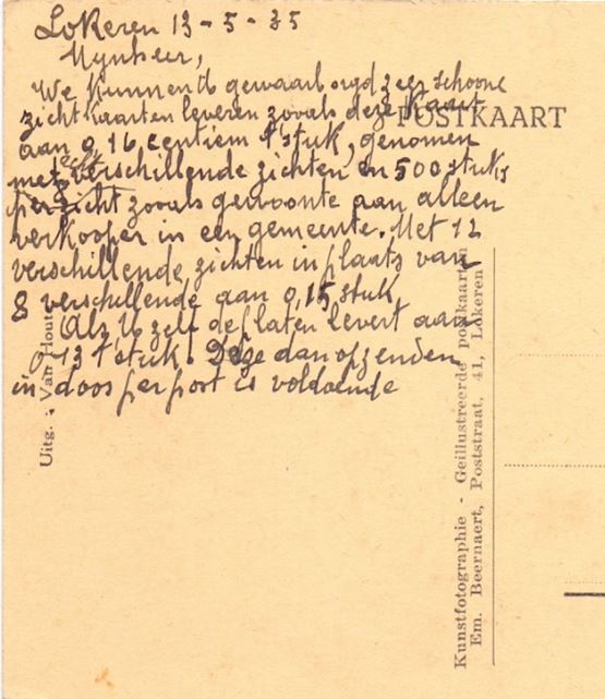 Halfweg de jaren 1930 werden nog vier kaarten uitgebracht door Em. Beernaert uit Lokeren. Herkenbaar toch ook aan bijschrift, vorm en kleur. Kunstfotograaf Beernaert was actief in heel Vlaanderen. Als uitgever wordt een zekere Van Houte vermeld. Zoals u hieronder kan lezen op deze achterzijde prijst Beernaert zijn kaarten aan met vermelding van prijs. Van de kunstfotograaf Beernaert waren ook verschillende zichten te koop, uitgegeven door ‘Wwe Buysse – verfwaren – Behang – balatum , Kloosterstraat 21’.