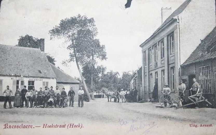 Iets jonger is een reeks van acht kaarten uitgegeven in Knesselare verkocht door onze dorpsgenoot Jules Arnaut, die toen vooraan de Kloosterstraat woonde. Jules Arnaut en zijn zoon Octaaf drukten vanaf die tijd als eersten in Knesselare bidprentjes, “doodsbeeldekens” zoals men meestal zegt.Hij en zijn zoon Octaaf hadden er een drukkerijtje, maar de postkaarten werden gedrukt bij uitgever-drukker Van Cortenbergh in Brussel. Een mooi exemplaar is bovenstaande foto van de Hoekstraat. Die serie draagt het opschrift ‘Knesselare, boek- en drukh. J.Arnaut-Gijselbrecht’. De oudste gedateerde foto werd verstuurd in 1905. Opdruk is in rode of bruine inkt.