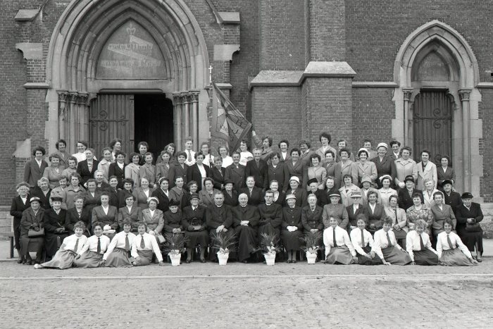 Ook al aan het feest toe: de Boerinnenbond van Knesselare, die hier was gesticht in 1911. Voor wie er mocht aan twijfelen: zo’n vieringen verliepen toen vooral erg christelijk, met ’s ochtends een communiemis met kanselrede door de proost, een samenkomst aan de Grote Kapel waar pater Goegebuer een sermoen hield, een optocht door het Dorp naar de parochiezaal, alwaar een lezing volgde over vijftig jaar Boerinnenbond (later KVLV). Na de feesttafel trok men alweer ter kerke voor het danklof.