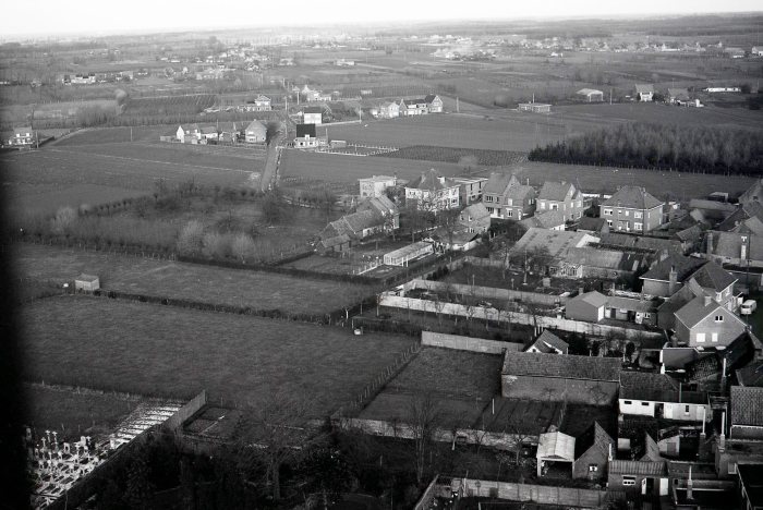 Het romantisch beeld dat ik van Knesselare had komt allicht door die interesse in de natuur en de open ruimte die door verkavelingen grotendeels verdwenen is. Het lijkt mij interessant om eens luchtfoto’s uit 1970 en 2018 met elkaar te vergelijken, als die bestaan. (Hieronder proberen we dat even in beeld te brengen met zicht op de Nieuwstraat van toen en van nu – red.)