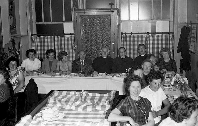 Onder meer de KAV kwam in De Kring bijeen voor kooklessen en de daarbij soms horende feesttafels. Hier met burgemeester Devreese, pastoor Hubert Bruwiere en de onderpastoors Alfons Strobbe en Edmond Van den Broeck