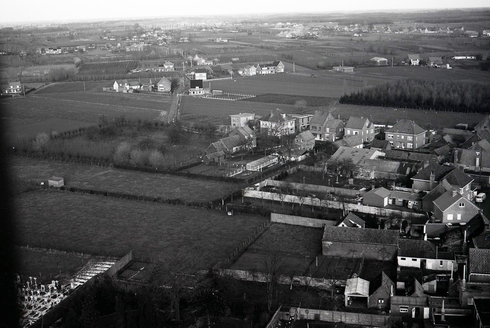 Het romantisch beeld dat ik van Knesselare had komt allicht door die interesse in de natuur en de open ruimte die door verkavelingen grotendeels verdwenen is. Het lijkt mij interessant om eens luchtfoto’s uit 1970 en 2018 met elkaar te vergelijken, als die bestaan. (Hieronder proberen we dat even in beeld te brengen met zicht op de Nieuwstraat van toen en van nu – red.)
