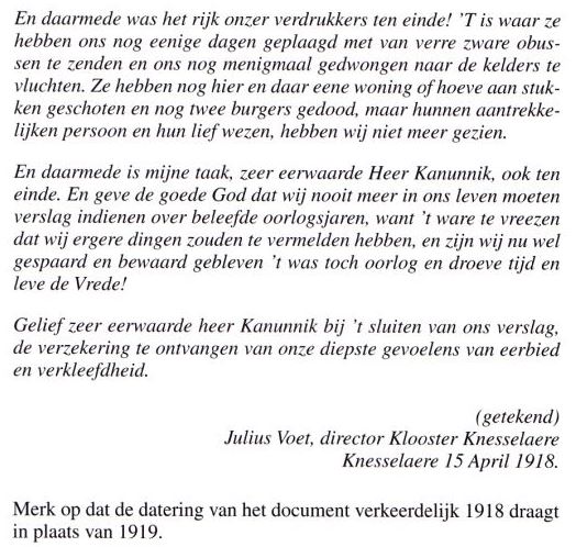 “Onze verlossing uit het Duitsche juk, heeft plaats gehad den zaterdag 19 Oktober 1918 om 5.30 ’s avonds. Van rond 1 ure middag wier een hevig geweer- en mitrailleurzenvuur gewisseld tusschen de opkomende Belgen uit de richting van Brugge en de Duitschers die zich rondom het klooster verschanst en verscholen hadden. ’t Klooster was een uitmuntend steunpunt voor de Duitschers en ze hadden er zelfs eene mitrailleuze geplaatst op eene bovenkamer die uitgeeft op de richting van Brugge en eene groote opene vlakte beheerscht die ’t klooster (’t laatste gebouw van Knesselare) van den wijk Zeldonck (Oedelem) afscheidt.