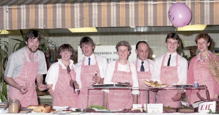 De familie De Kesel heeft Knesselare geruime tijd van vleeswaren voorzien. Foto van de familie op de Avondmarkt van 1987. Vlnr: Toon, Dorine (vrouw van Kurt), Kurt, Jeanine Van Hyfte (moeder), Gerard (vader), Chris en Dina Van Renterghem (ex-vrouw van Toon)