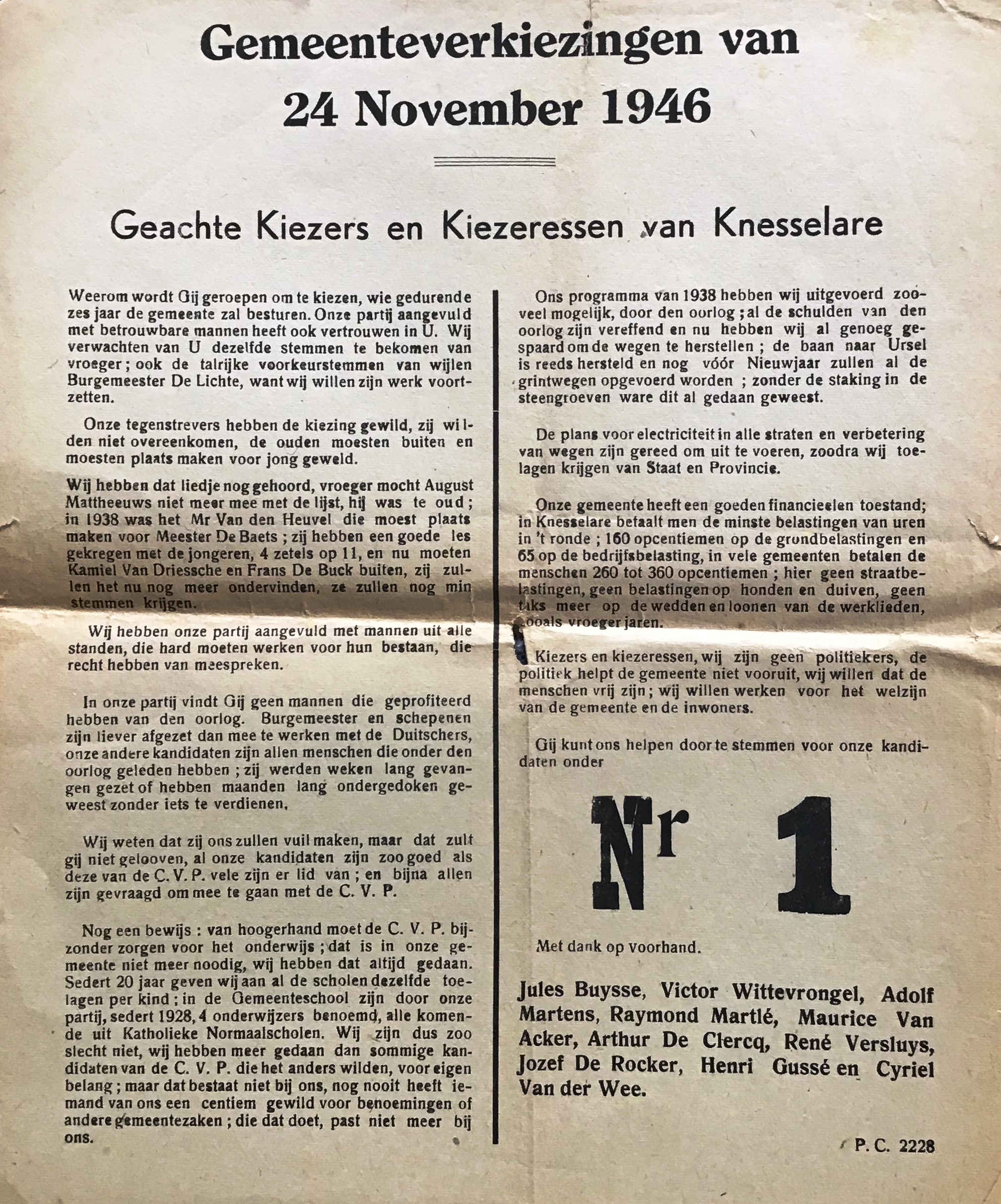 Nog even wordt geprobeerd het oorlogssentiment mee te laten spelen: “In onze partij vindt Gij geen mannen die geprofiteerd hebben van den oorlog. Burgemeester en schepenen zijn liever afgezet dan mee te werken met de Duitschers…zij waren weken lang gevangen gezet of hebben maanden lang ondergedoken geweest zonder iets te verdienen…”