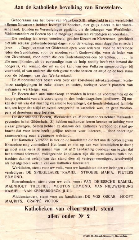 Nog interessanter is de keerzijde van het pamflet waarin de “katholieken” het uitgebreid hebben over hun STANDEN-partij, een koepel waaronder zowel middenstanders, boeren en werknemers samen de politiek probeerden te bepalen. De kandidaten werden aan een stand toegewezen, “gehoorzaam aan het bevel van Paus Leo XIII”.