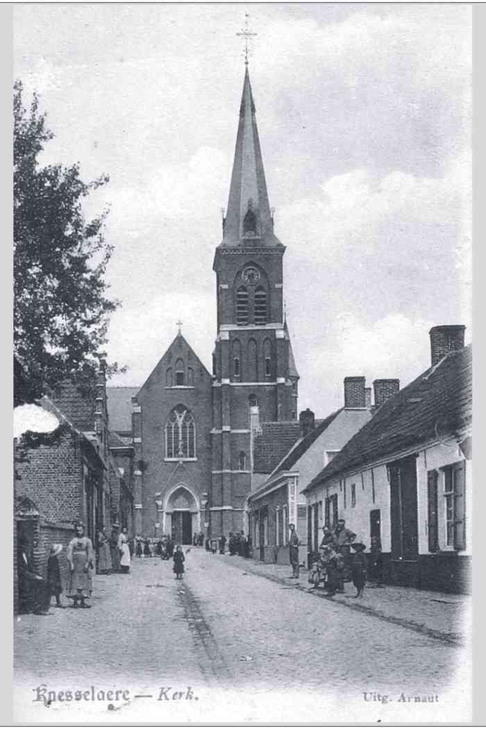 Foto Kerkstraat rond 1900. Helemaal rechts bovenaan hangt een wiel aan de gevel (ter hoogte van het huidige huis Vanden Brande. Daar woonde de familie Gernaey. waar Feelken Saintobyn (vader van Albert en grootvader van Joost) zijn stiel van fietsenmaker zou hebben geleerd.