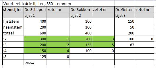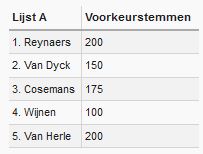 De eerste fase is simpel: Het aantal stemmen van elke lijst wordt opgeteld (de drie keuzes van hierboven). Hieronder een concreet voorbeeld: in gemeente X zijn er drie lijsten (De Schapen, de Bokken en de Geiten).