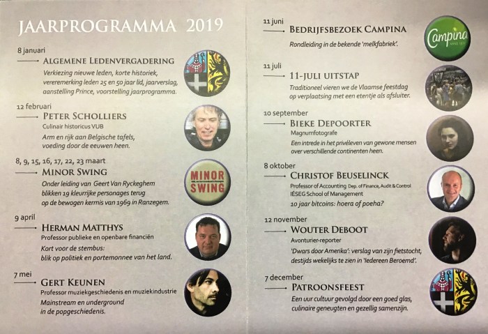Inzake lezingen staat het volgende op het programma: Peter Scholliers (culinair historicus) over ‘Arm en rijk aan Belgische tafels, voeding door de eeuwen heen’, Herman Matthys (professor publieke en openbare financiën met een blik op politiek en de portemonnee van het land, Gert Keunen (professor muziekgeschiedenis) over de popgeschiedenis, Bieke Depoorter (Magnumfotografe) over haar fotografie, professor Christof Beuselinck over bitcoins en Wouter Deboot (reporter) over zijn fietstocht door Amerika. Data: zie programma hieronder. Topevenement van het jaar is het toneelstuk Minor Swing op zeven avonden in maart (8, 9, 15, 16, 17, 22 en 23).