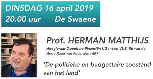 Na de voorjaarsdrukte met het toneel, gaat de aandacht nu opnieuw naar de lezingen. Dinsdag 16 april is Herman Matthijs te gast. Hij is hoogleraar aan de universiteiten van Gent en Brussel en is ook lid van de Hoge Raad voor Financiën, die de overheid adviseert. Als weinig anderen weet hij hoe het nu zit met onze gezamenlijke centenwinkel. De prof komt ons informeren over de staat van onze gezamenlijke portemonnee, over hoe regeringen die beheren en over hoe geloofwaardig politici (ook straks weer in volle verkiezingstijd) met miljarden omspringen. Is een federaal begrotingstekort van acht miljard een putje of een ravijn? Is de schuldenberg een ramp voor onze kindjes? Moet de staat besparen of uitgeven en belasten? Hoe kijkt een financieel expert naar het sociale debat en de wisselwerking tussen economie, immigratie en ongelijkheid?