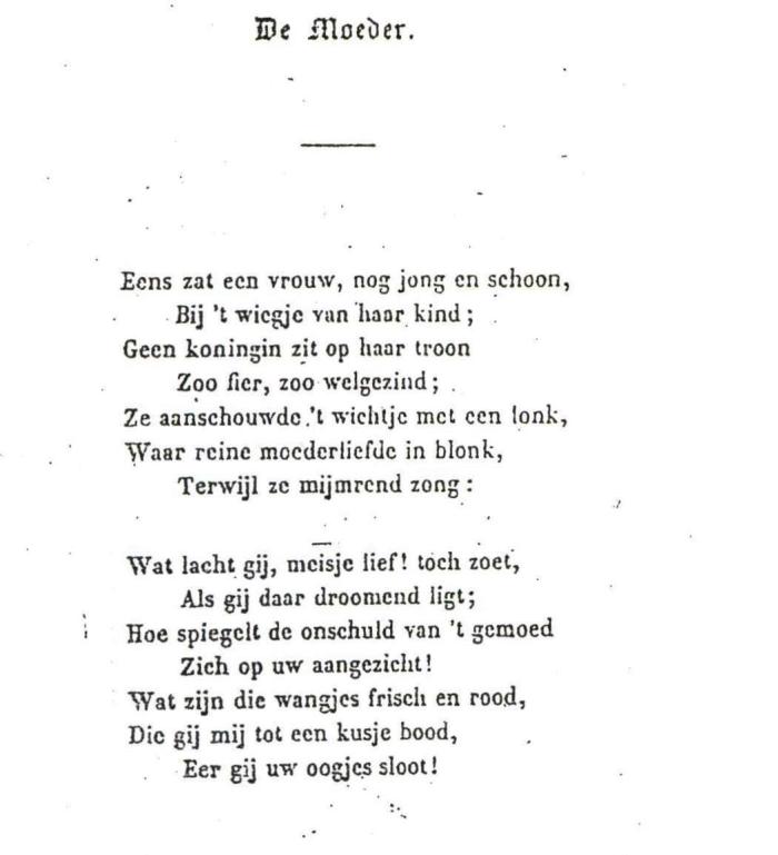 Vanzelfsprekend lees je zo’n teksten best met wat empathie voor de tijd van toen, de jaren 1860. De gedichten/liederen zijn vooral romantische mijmeringen op rijm, in dit geval over de moederliefde. Maar ook dat moet eens kunnen. De boodschap is duidelijk.