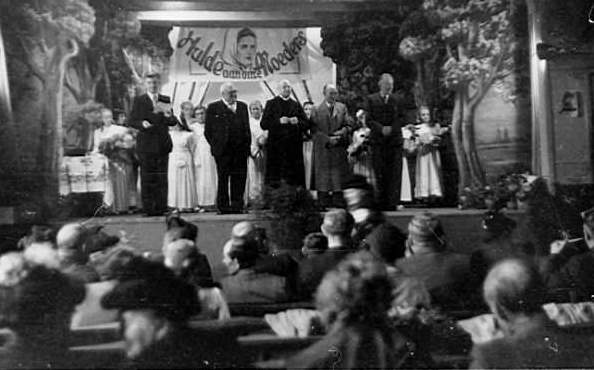 Het oudste tijdsdocument waarover we beschikken is onderstaande foto van een bijeenkomst in onze patronage (feestzaal) in de Kloosterstraat (zie hierboven). Vermoedelijk dateert de foto uit de jaren 1950. Onder meer de Bond van de Grote Gezinnen organiseerde hier al een paar tientallen jaren eerder Gezinsfeesten, maar tegelijk ook Moederfeesten, waar onder meer ook moeders van echt grote gezinnen (tien kinderen) werden gevierd.