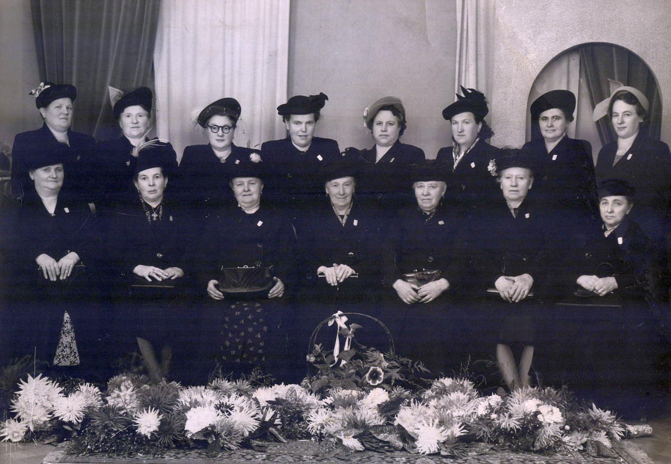 De Gezinsbond vierde de moeders van tien kinderen als heldinnen op het podium. Vijftien moeders, meer dan 150 kinderen. Op de foto rechtop staand: Celine Brinckman (Emiel Saey), Martha De Prest (Mattheeuws), Alice Huyvaert (Arthur De Clercq), Jeannette Lippens (Cyriel Andries), Paula Heyse (Edmond De Loof), Marie Van Mulle (Florimond Cockuyt), Marcella De Coster (Denis Bouché) en Anna Gussé (Jules De Muynck). Zittend: Alice Boute (Raymond Stock), Emma De Serrano (Henri Vermeire), Leontine Rodts (Odiel De Vlieger en Claeys), Marie De Wispelaere (Alfons Hooft), Irma Vermeire (Henri Andries), Leonie Veevaete (Herman Van de Casteele), Celine Nuyt (Jozef Van Hooreweghe) (Foto Hooft, 1950)