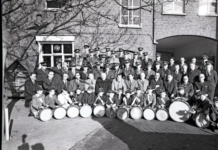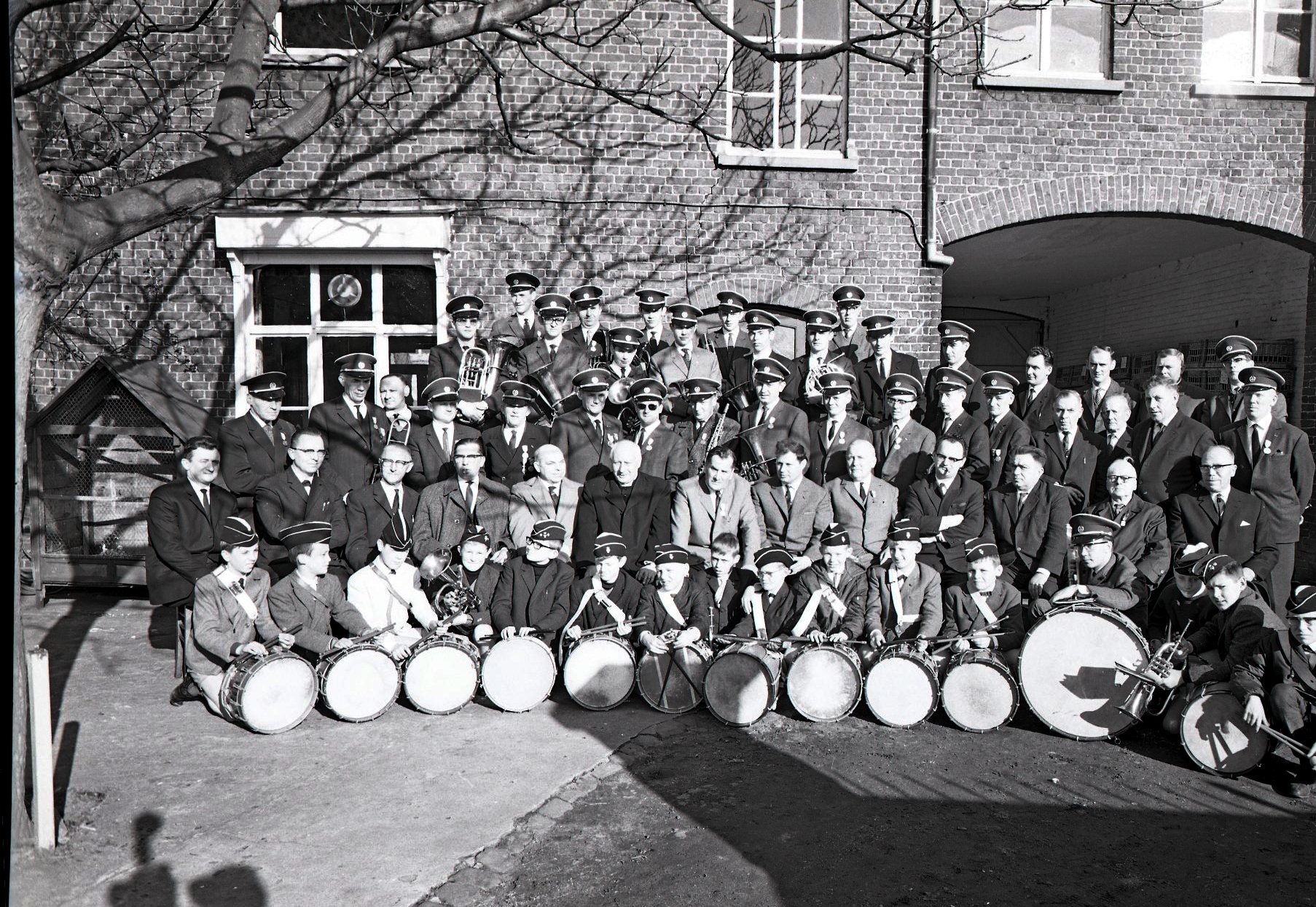 Om af te ronden nog een van de weinig groepsfoto’s van de fanfare uit de jaren 1960, genomen met iets te veel frontaal zonlicht, achteraan de Litanie. Maar toch een mooi tijdsdocument, met vooraan op de foto een grote nieuwe lichting jonge muzikantjes. We geven even hun namen: Luc Serlet, Toon Vandeweghe, Rudi Wittouck, Hugo Van Hooreweghe, Johan Gussé, Theo De Vliegher, Paul Devreese (?), Rik Vandenberghe, Dirk Dejaegher, Filip Vanthuyne, Karel Van Poucke, Marnix Poelman, Gabriel Bert, Jan Van de Casteele, Luc Van Yper en Yvan Gussé. De fanfare liep toen voor het laatst rond zonder uniform, behalve dan “het schuitje” en de kepi. Na een paar crisisjaren waren uitbreiding en verjonging van ’t muziek grotendeels het werk van Gerard Van de Casteele. Recent toegetreden waren toen ook Walter Taghon, Hubert Mouton, Eddy Vermeire (bovenaan), Arnold Buyse, Paul Cooreman, Paul Verhoestraete, Luc Neirynck, Willy Devreese, Tony Verhoestraete en Roger De Vlieger (tweede rij)