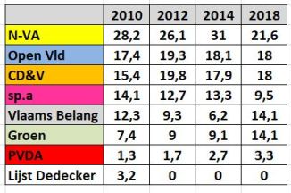De N-VA was in 2010 al veruit de grootste partij, en is dat was ook zo in 2014. Ze steeg van 28,2 naar 31 procent. De twee jongste nationale peilingen van mei (VRT en VTM, zie tweede tabel verderop) gaven aan dat de partij bij de huidige verkiezingen in Vlaanderen zo’n vijf procent zou verliezen.