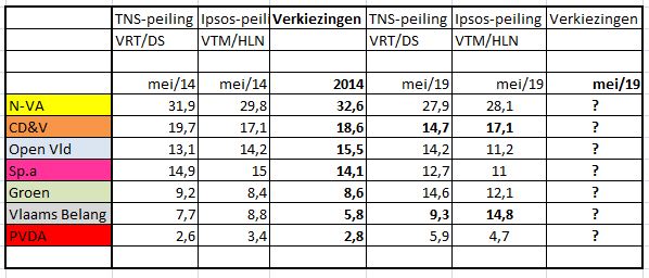 Tabel 2. Hier gaat het om de “Vlaamse” score van 2014. Ter vergelijking de voorafgaande grote peilingen van VRT en VTM