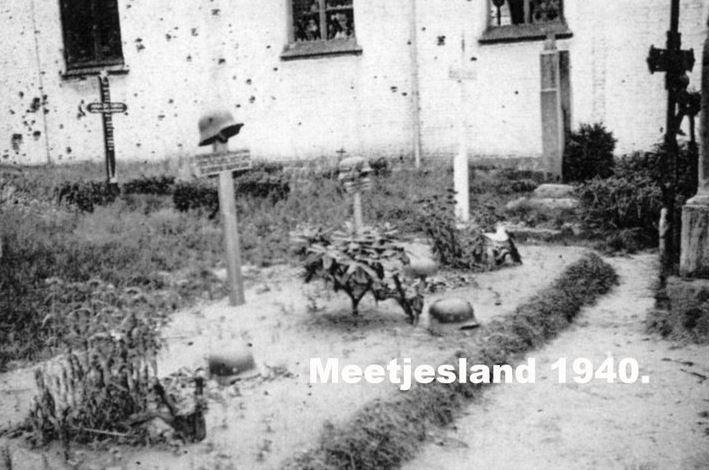 En toen ging het van Ursel naar Knesselare. De oorlog eiste ook veel Duitse slachtoffers. Duitse soldaten werden begraven voor de kerk van Ursel (let op de kerkmuur … Foto Meetjesland1940.be)