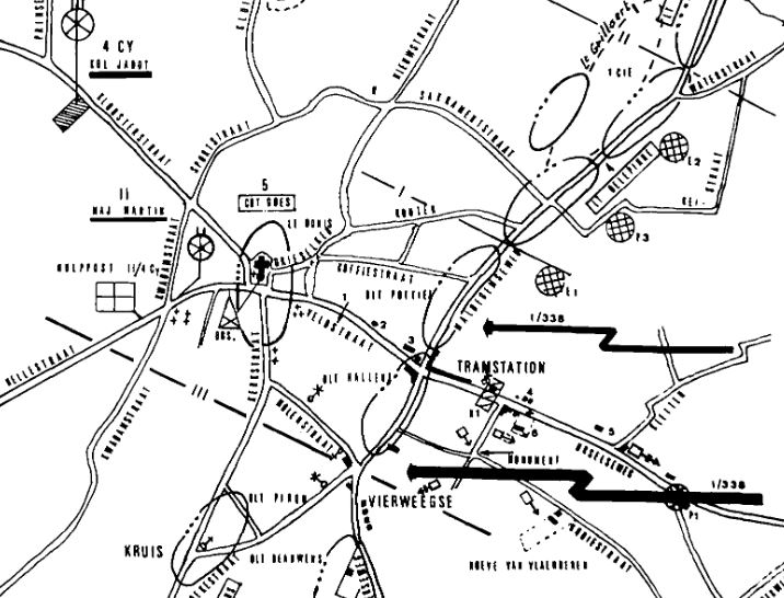 “Ja, het oorlogsmonster was tot hier gekropen. In het Oosten, waar de lucht vol gebonk en gedommel was, in het noordwesten, waar een groote vuur- en rookkolom de brand aanwees van Oostvelds kerk. Om een uur of zes werd het in het centrum voor iedereen echt onhoudbaar. Ik zelf ben dan ook gevlucht naar een buitenwijk (het hoevetje van Alfons De Neve in Eentveld). Alle leven in de huizen onderweg was weggestorven. Wanneer ik omkeek zag ik achter mij den toren met zijn doorschoten spits, zag ik in de Nieuwstraat het puin van getroffen huizen en verder den hoogen vuurgloed van de laaiende gemeenteschool. In de Kerkstraat hing nog de rook van twee uitgebrande huizen … Aan de Tramstatie stonden twee mooie villa’s in vuur en vlam. In de richting van Ursel hoorde ik duidelijk het knetteren der machinegweren.