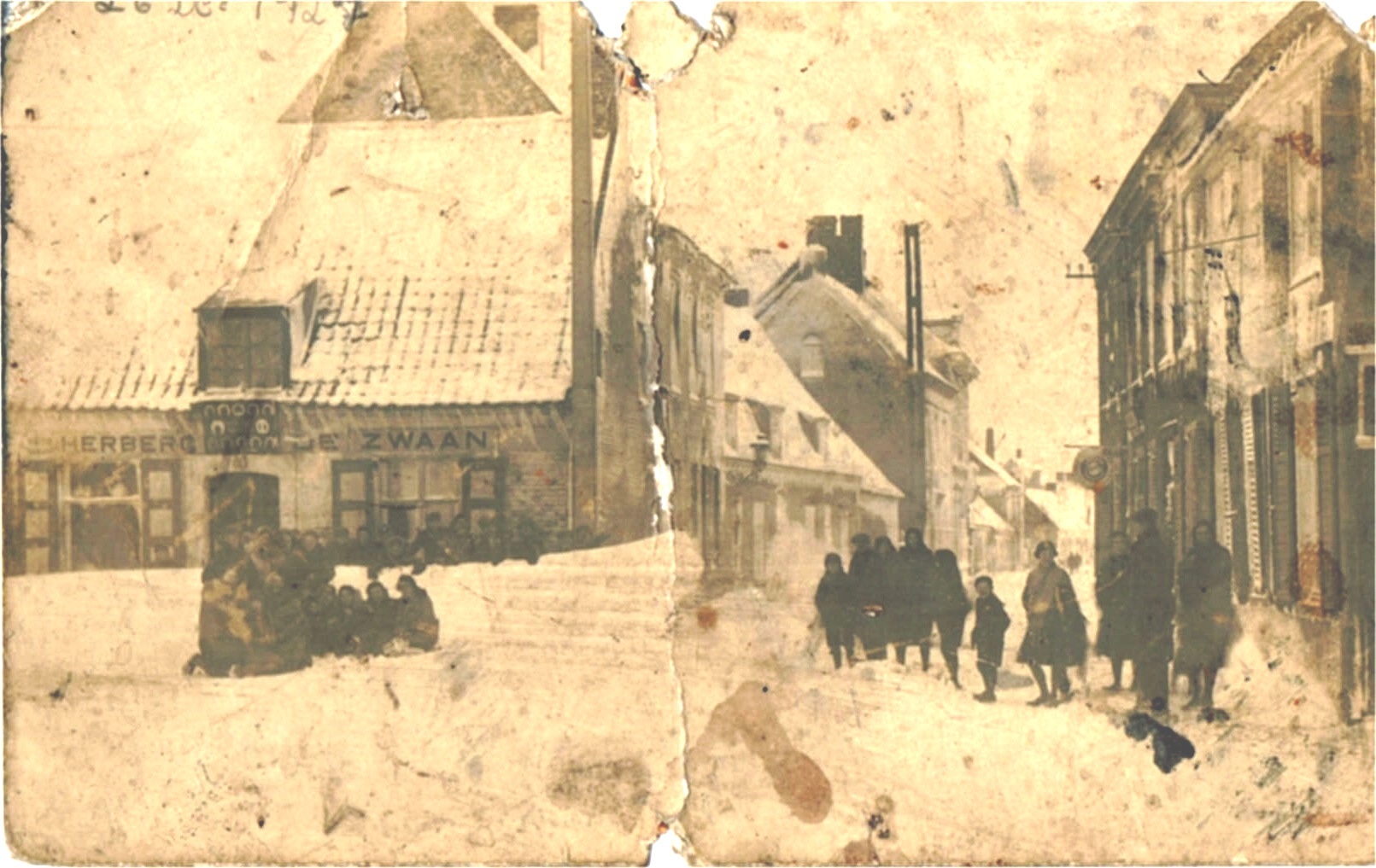 Foto van het ouderlijk huis (rechts) op De Plaats in Knesselare, die Henri op zak had toen hij door een obus dodelijk werd getroffen. Bemerk de bloedsporen. Teruggevonden bij de verhakkelde lichamen.