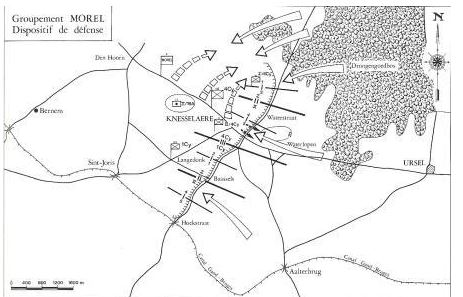 De 4de Karabiniers-wielrijders moesten koste wat kost het dorp Knesselare en de Urselweg verdedigen. Rechts naast hen – van Urselweg tot het kanaal moest het 1ste standhouden. Eenheden van de artillerie stonden dan weer einde de Kloosterstraat opgesteld. Daar werd ook het gevechtshoofdkwartier gevestigd, in het klooster van de zusters Franciscanessen in de Kloosterstraat; Enkele geblindeerde wagens werden aan de provinciegrens en in Langendonk in reserve gehouden. Het 4Cy moet de ondersector Eentveld-Knesselare voor zijn rekening nemen en zal op zijn rechterflank ondersteund worden door het 1Cy dat naar de Hoekestraat dient te vorderen.