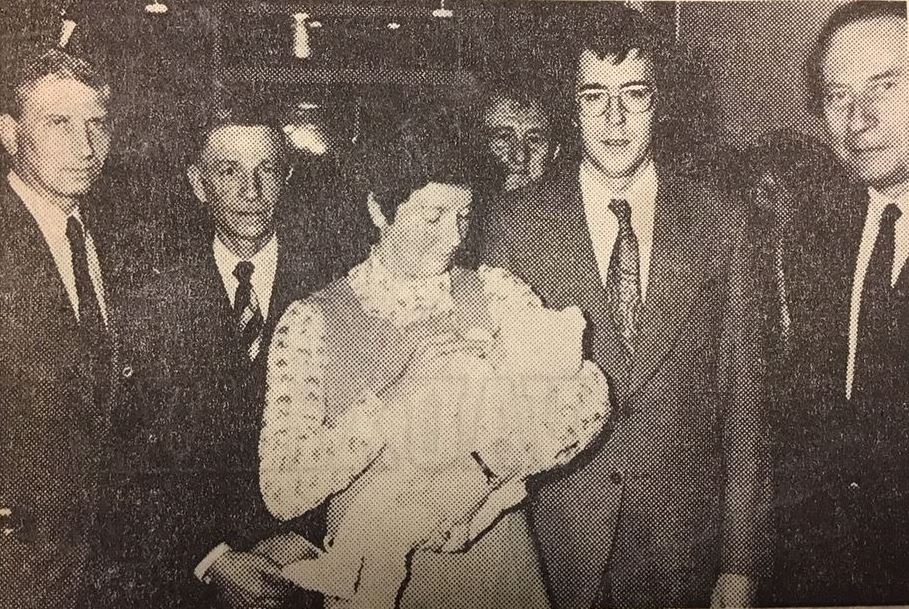 De ouders met hun baby, de 5000ste inwoner van Knesselare, omringd door secretaris Jozef Arnaut, schepen Albert De Spiegelaere, schepen André Busschaert en graaf D’Alcantara.