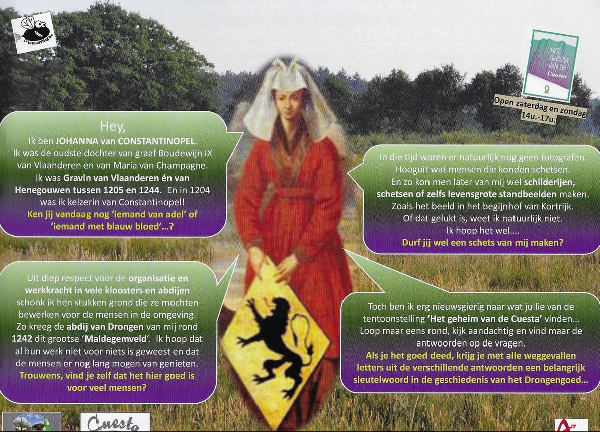 Cuesta – Zo is er de permanente tentoonstelling ‘Het geheim van de Cuesta’. Die geeft een prima beeld over de eeuwenoude wisselwerking tussen mens en natuur op de Cuesta (heuvelrug) te Ursel, of voor wie het groot ziet in Knesselare, waar die Cuesta natuurlijk doorloopt. In de tentoonstellingsruimte in de Drongengoedhoeve leer je meer over het noeste ontginningswerk van mensen op een stugge ondergrond. Voor de kinderen vanaf zes jaar is er een kindgericht wedstrijdblad om aan de hand van de tentoonstelling ‘het sleutelwoord’ te ontdekken… Ze worden er een stukje op weg geholpen door Johanna van Constantinopel, de Vlaamse gravin (13de eeuw), die omvangrijke gebieden in het Maldegemveld aan de abdij van Drongen aanbood. Open op zaterdag en zondag van 14 tot 17 uur.