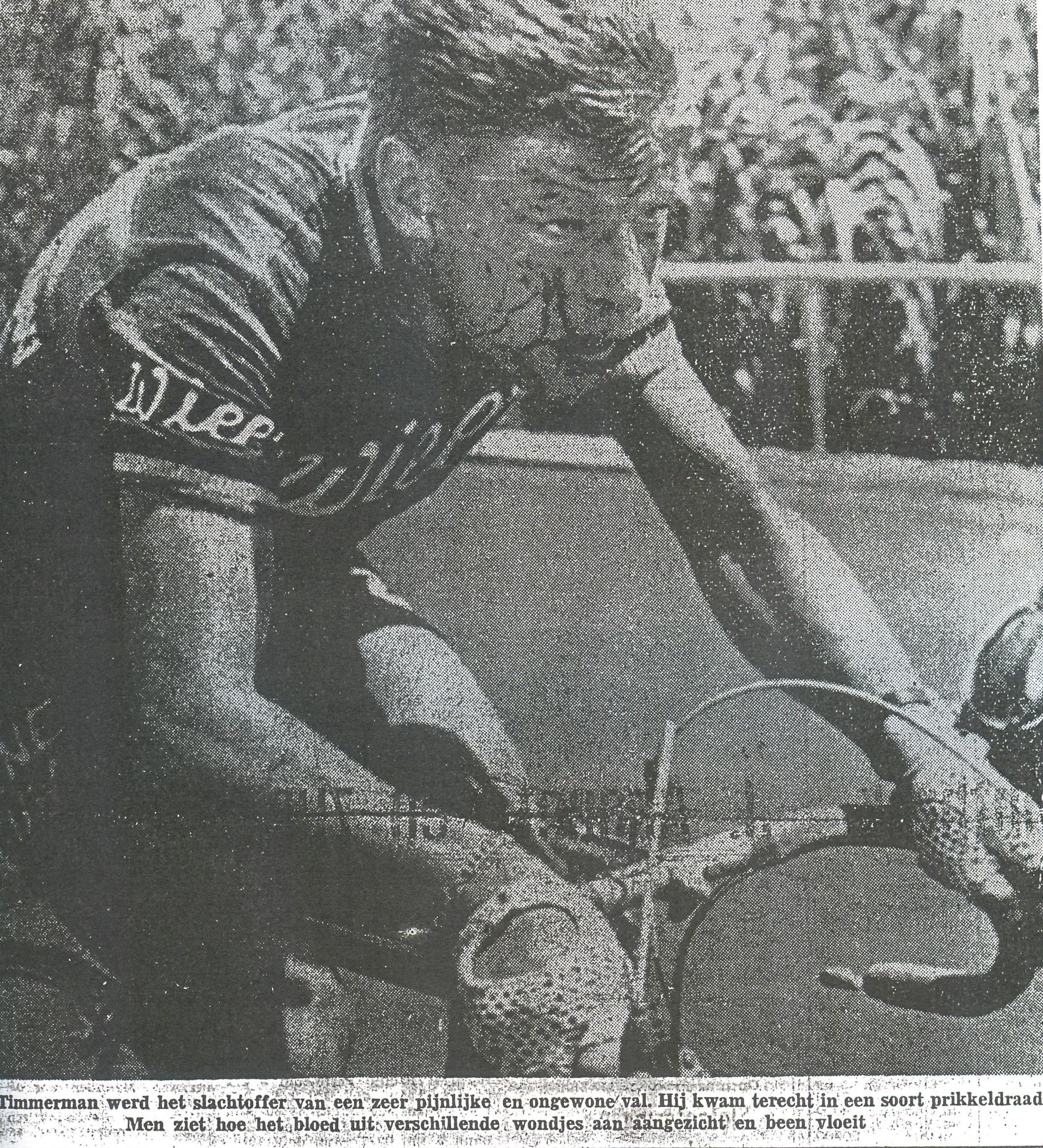 Ook de “val” van Jef Timmerman in de Ronde van Frankrijk 1964 zit hier nog wel even in het collectieve geheugen van de oudere sportliefhebbers (zie foto). Hierover vertelde Jef: “Dat gebeurde niet tijdens een ontsnapping. Ik reed in een lang gerekt peloton. Taccone zat toen voor mij. Ik raakte zijn wiel, kwam in de zijberm, een soort prikkeldraad en vervolgens in de ravijn terecht. Gelukkig dat de struiken mijn val braken. Het was een beetje zoals de over heel de wereld verspreide val van de Nederlander Wim Van Nest. Alleen ging die toen nog een eind dieper. Op tv en in de kranten verscheen ik met bebloed gezicht, terwijl tourdokter Dumas me verzorgde, maar het viel al bij al mee. Ik heb nog voortgereden, maar achteraf bleek dat een kraakbeen in mijn knie toch serieus was geblesseerd.” Andere bronnen leren dat Jozef ook in Parijs-Nice eens een solo-vlucht van honderd kilometer ondernam.