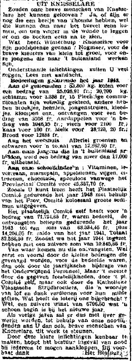 Over de eigen tussenkomst van Winterhulp Knesselare verscheen onderstaand stukje in ’t Getrouwe Maldegem over uitgaven en hulp in 1943: VITAMINEN EN LEVERTRAAN…