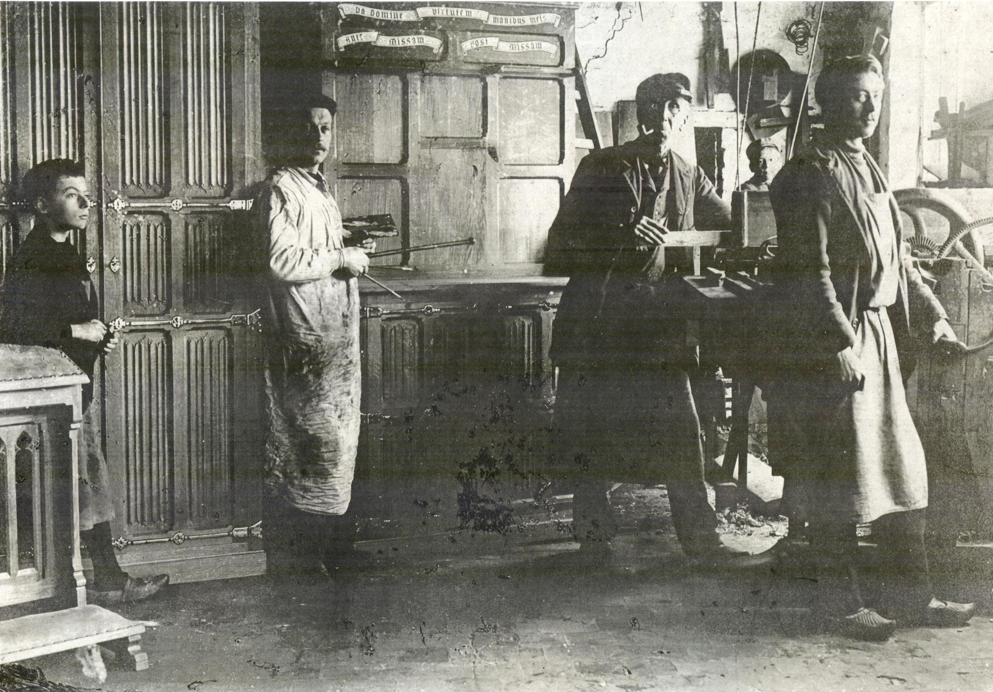 Bernardus Hooft, pijp in de mond, aan het werk (kerkmeubilair). Links zijn kleinzoon Maurits Hooft, twee gebroeders Buyse en Emiel Speeckaert