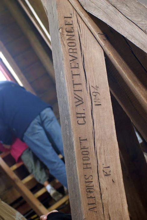 Het was Jurgen Schepers die ons het eerst een correct antwoord stuurde. De inscriptie – Alfons Hooft en Ch. Wittevrongel – is te vinden op de balken van onze kerktoren. “Ik heb die balk al eerder gezien, namelijk op de Open Monumentendag in 2009. Toen kon je tot helemaal boven in de Sint-Willibrorduskerk. Hij stuurde ons ook zijn foto van toen en die geven we hier graag mee.