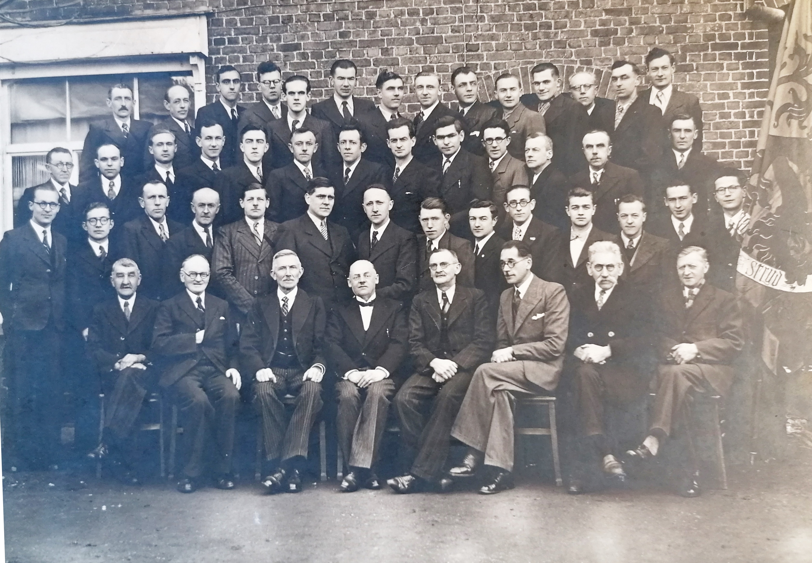 Academische zitting voor de 50-jarige Strijdbroeders. Op de foto een gastspreker voor het bestuur, met onder meer Adolf De Baets, Florent Spanhove, Leon Rodts, Alfred Segers en Maurits Hooft.