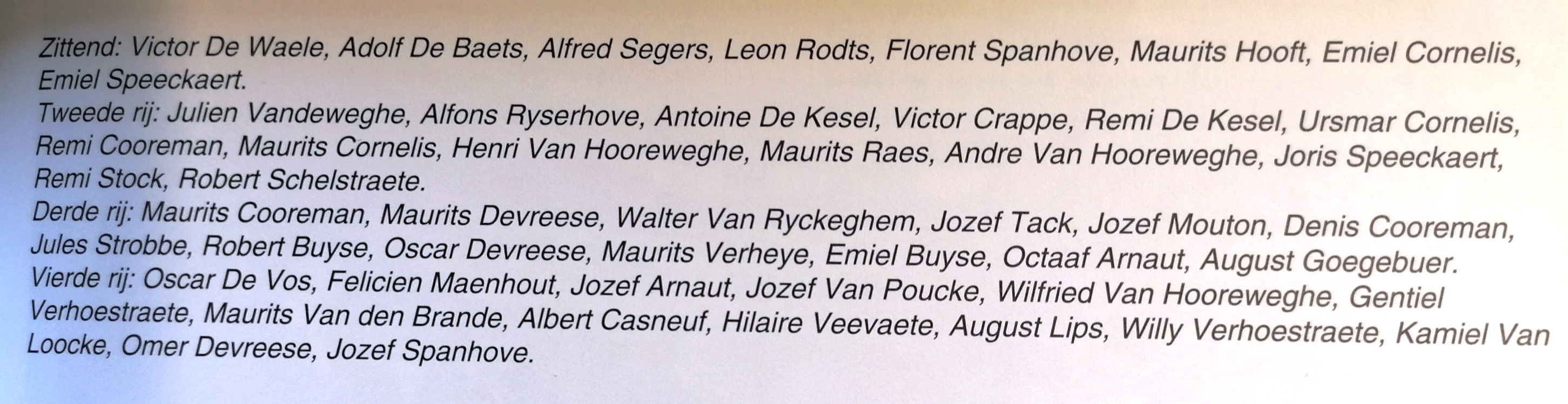 We herkennen Maurits Cornelis (Modest), trommelaar Leon Van de Casteele, klaroenblazer Michel Mouton, Raymond Van Hulle, Maurits De Reu, Victor Van Poucke, André Boeuillaert, Armand Van Poucke, “chef” Pierrre Van Renterghem, Jozef Dobbelaere, Gentiel Verhoestraete (verscholen) en Robert Schelstraete.