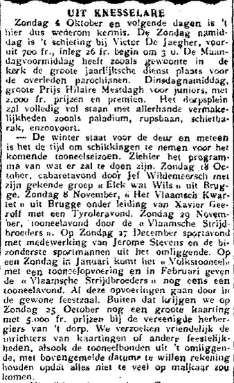 Ook de Strijdbroeders, met Leon Rodts nog als voorzitter, schenken de opbrengst van hun oorlogstoneel aan het goede doel, onder meer Winterhulp.Knesselare kreeg ook een bijzondere vermelding “voor zuivere uitspraak” …