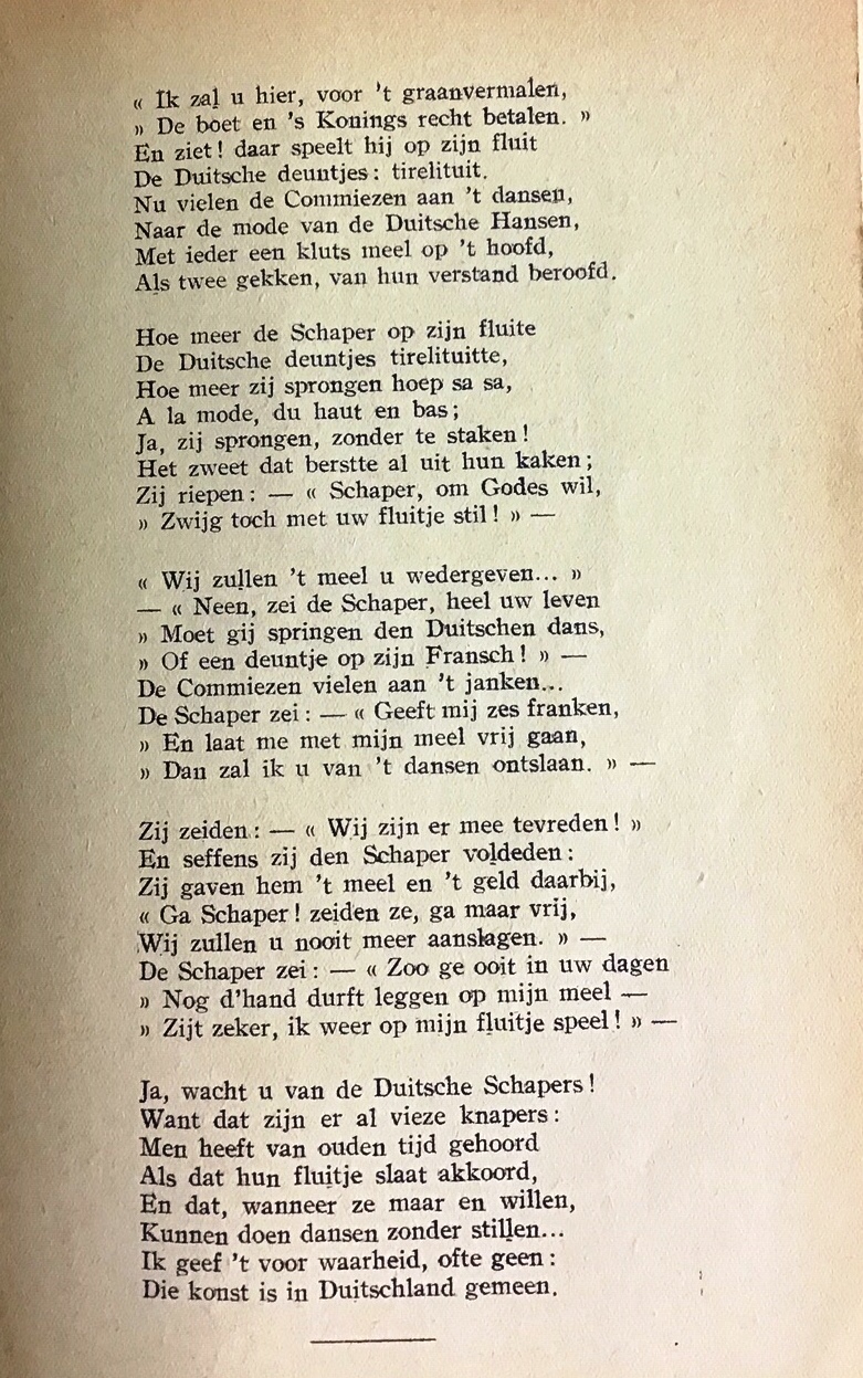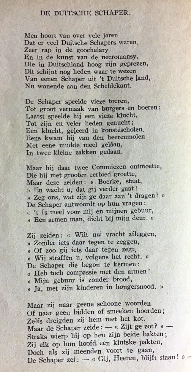 Vroeger in den tijd on (als) ‘t er Duitse schapers (herders) alhiere waren was ‘t er hier op ne zekre keer nen Duitse schaper in het Keigat van Ursel. En die gink mee zijn schapen al de wijk Keigat en ‘t wierd slecht were en ‘t stond daar een café Eduard Muls genoemd. En die gingt daar binnen en ot hij daar binnen kwame, waren d’er nog 3 mannen en die vroegen aan dien Duitse schaper voor een spel mee te kaarten. En ‘t was slecht were, die lettige (wachtte) niet, die was kontent en die ga weeromme buiten en die zegt tegen zijn schapen. “Leg elder allemale nere”. En van ot (als) hij da gezeid had die schapen leggen elder (zich) nere, die verroerden elder nie meer. En ze gingen aan ‘t kaarten. Onze (als ze) verscheidene bomen (spelen) gekaart han, het verleetige (verveelde) dienen Duitse Schaper en wat dat hij deed binst danze kaartigen; hij moest met de kaarten delen. Hij gaf zijne tegenmaat 4 zotte, zijne maat vier zotte en zijnen andren tegenmaat ook vier zotte en zelve had ‘t er hij ook viere. Zo ze verwonderdigen elder daaran. Tons wisten ze dat dienen Duitse schapre wel iets koste en de kaarte wierd nere geleid, ‘t verteir betaald en hij ging buiten, zei tegen de schapen “sta recht, me gaan gaan wandlen” en de schaper was ‘t er vandoor. (getuigenis van August Scheyvinck, 69 jaar, leurder en seizoenarbeider in Knesselare, in de vroege jaren 1960).